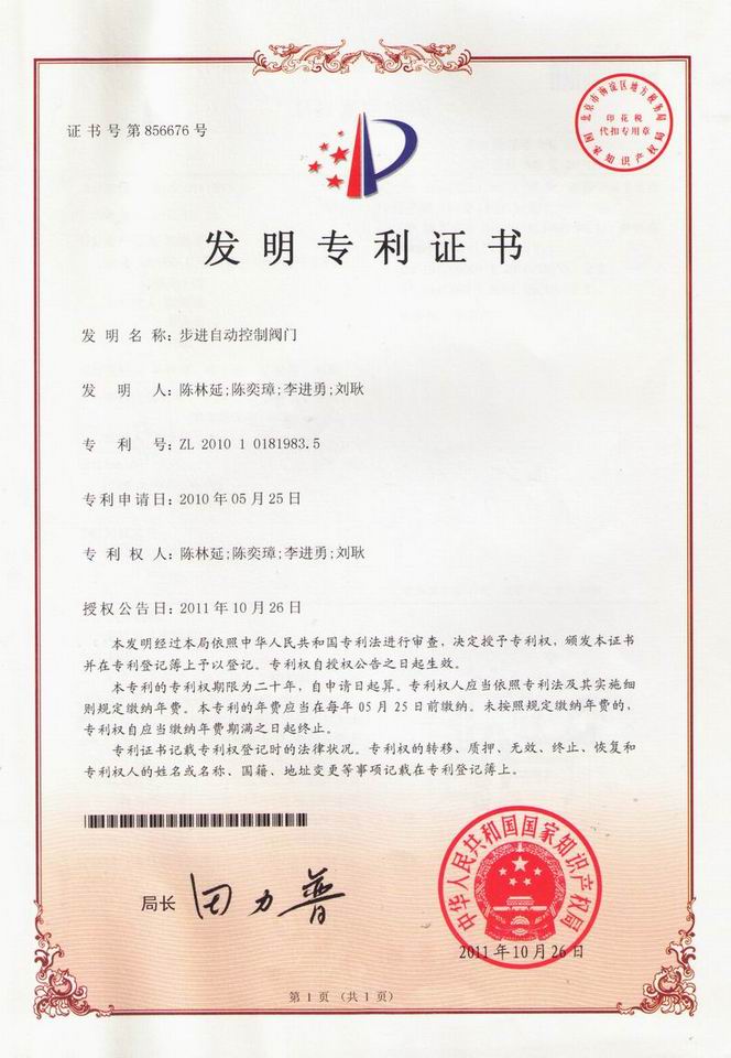 經(jīng)過公司研究人員兩年多的不懈努力,刻苦鉆研“步進(jìn)自動控制閥門”研發(fā)成功,并于2010年5月25日向國家知識產(chǎn)權(quán)局申請專利保護(hù)。國家知識產(chǎn)權(quán)局經(jīng)過實質(zhì)性審查,于2011年10月26日授予專利權(quán)并頒發(fā)發(fā)明專利證書。