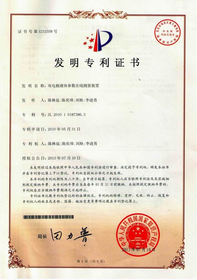 本發(fā)明的目的是提供一個(gè)雙電極液體多參數(shù)在線測(cè)量裝置,結(jié)構(gòu)簡(jiǎn)單,工作可靠和使用方便,能同時(shí)檢測(cè)多個(gè)液體的相關(guān)參數(shù),自動(dòng)清洗電極表面,提高檢測(cè)精度。我司著重加大對(duì)科研的投入力度,積極開(kāi)展技術(shù)創(chuàng)新工作,通過(guò)多年來(lái)的努力,公司獲得國(guó)家專(zhuān)利授權(quán)多項(xiàng),其中發(fā)明專(zhuān)利2項(xiàng),實(shí)用新型專(zhuān)利4項(xiàng),在審的發(fā)明專(zhuān)利3項(xiàng)。